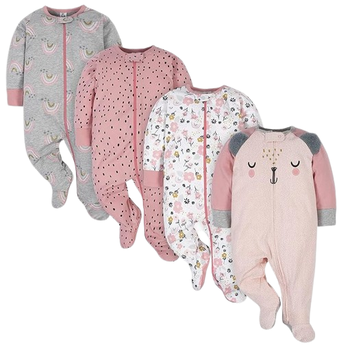 Includes four (4) long-sleeve Gerber sleep n’ plays Footie.